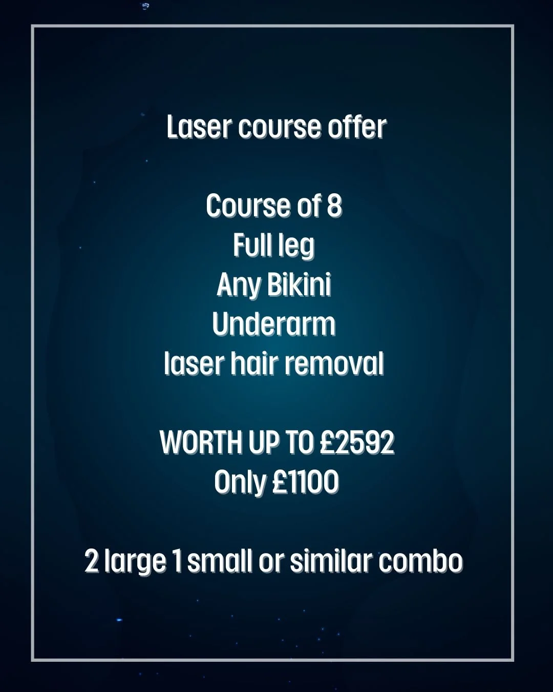 This can include large areas such as full legs, full back, chest and tummy, and full bikini front and back.