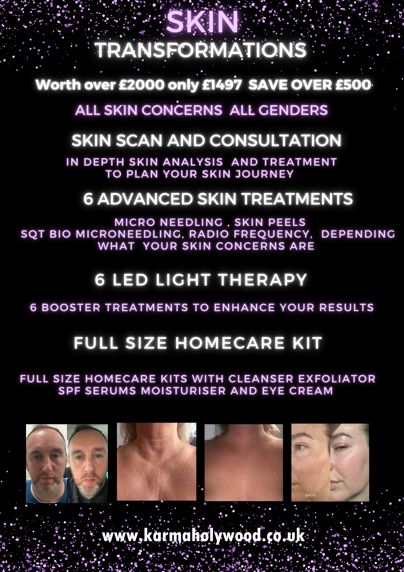 Included in your skin transformation is 6 Advanced Skin Treatments, designed to rejuvenate, revitalise, and transform your skin each treatment will be carefully selected to address your unique skin concerns: and ma contain a mix of anything from